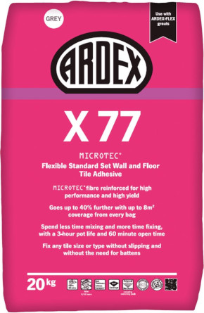 ARDEX X 77 MICROTEC® Flexible Standard Set Tile Adhesive has been specifically engineered to fit today’s tiles with ease, whilst also providing additional performance benefits that support modern fixing practices.